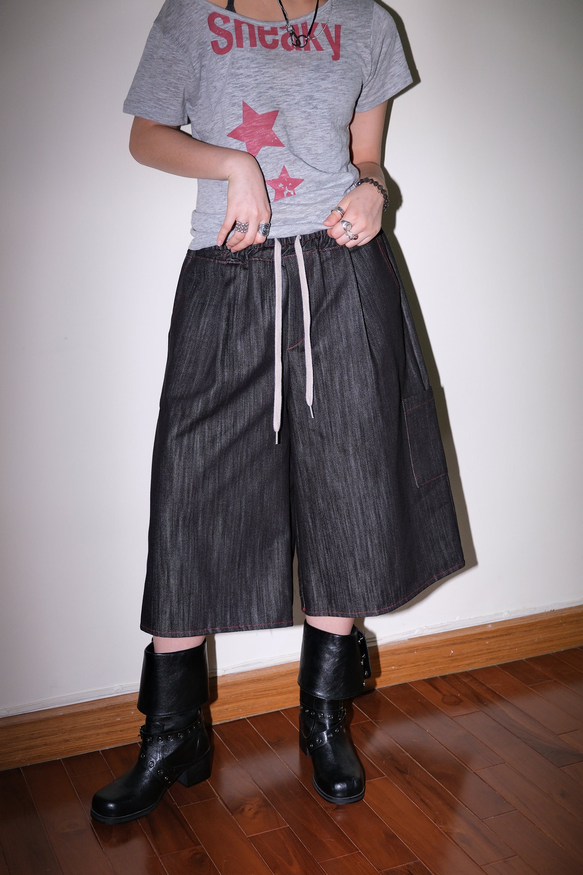 -原色帶有暗紋的牛仔短褲,低調成熟而不失細節