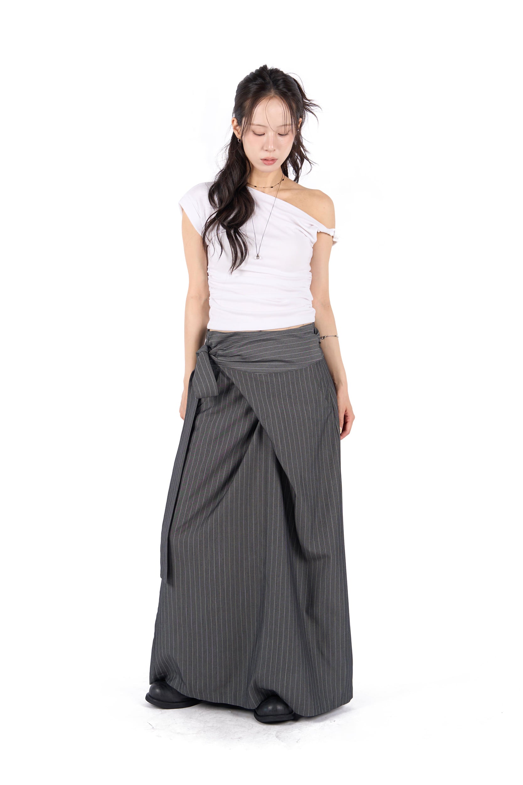-Stylish skirt with a calm striped pattern and a flowing wrap shape.