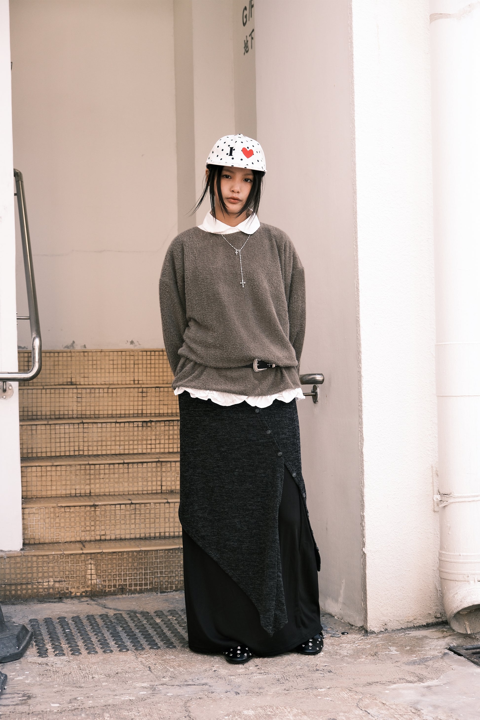 - 外層的斜長裙給人一種不平衡的點,營造出一種隨性的氛圍。